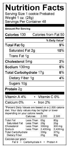 INGREDIENTS: flour (wheat flour, malted barley flour), Sugar, margarine (liquid soybean oil and partially hydrogenated soybean oil, water, salt, whey, soy lecithin, sodium benzoate and citric acid as preservatives, vegetable mono and diglycerides, artificial flavor, colored with beta carotene, vitamin A palmitate), Milk Chocolate Discs [Milk chocolate (sugar, cocoa butter, chocolate liquor, whole milk powder, soy lecithin, vanilla), sugar, artificial color (FD&C Blue 1, Blue 1 Lake, Yellow 5, Yellow 5 Lake, Yellow 6, Yellow 6 Lake, Red 40, Red 40 Lake, sorbitol, titanium dioxide, phosphoric acid, methyl and propyl parabens, caramel), corn syrup, wax, dextrin], Eggs, Water, Salt, Baking Soda (sodium bicarbonate), Natural Vanilla Flavor. Contains Egg, Milk, Soy, Wheat.
