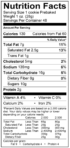 INGREDIENTS: flour (wheat flour, malted barley flour), margarine (liquid soybean oil and partially hydrogenated soybean oil, water, salt, whey, soy lecithin, sodium benzoate and citric acid as preservatives, vegetable mono and diglycerides, artificial flavor, colored with beta carotene, vitamin A palmitate), Sugar, white candy coating wafers (sugar, partially hydrogenated palm kernel oil, nonfat dry milk solids, whole milk solids, soya lecithin (emulsifier), salt, natural and artificial flavor), Brown Sugar, Eggs, macadamia nut pieces roasted in corn oil, Water, Salt, Baking Soda (sodium bicarbonate), Natural Vanilla Flavor.